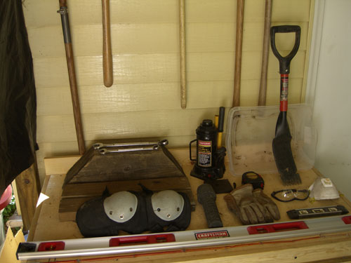 4 foot level, bullet level, knee pads, gloves, dust mask, goggles, flash light, wrenches,12 ton bottle jack, wood blocks, tape measure, carrying bin, plumb bob, small roofing tool, chop saw and grinder.
