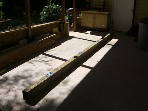 I used a 4" x 6" x 16' treated beam. The top support post plates are positioned 2 feet from the end and every 4 feet between the outside plates.