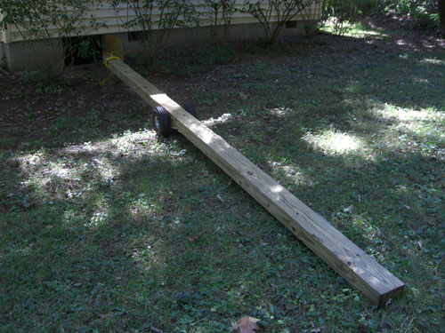 The wheels are mounted slightly off center to help keep the front off the ground. A rope is attached to the front end to pull the beam to the mounting location.