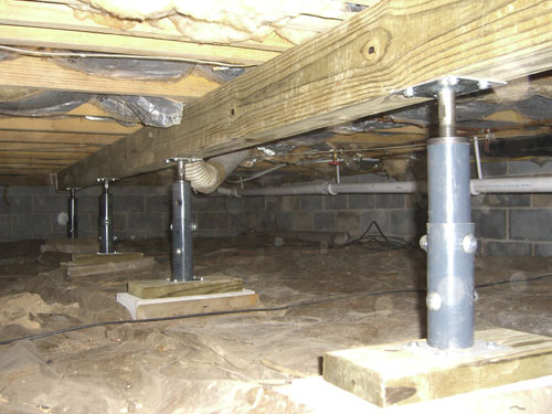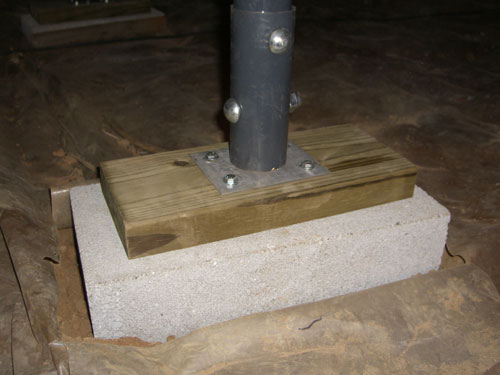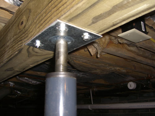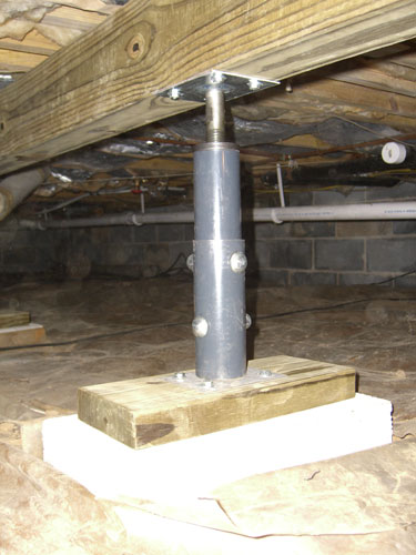 With all the support columns in place the 12 ton bottle jack was positioned between the 1st and 2nd and then the 3rd and 4th support columns to take the weight off the support columns. A 4 x 4 x 1/2 inch thick plate was used at the top of the jack to help disperse the weight and a variety of short boards were used under the jack to lift it up to the right height. A wrench was used to turn the column screws after the beam had been lifted by the bottle jack. Although much advise was given to jacking the floor only an 1/8 of an inch week I was able to raise the floor about 90 percent of the way the first day. The house didn't complain a bit. The next weekend, using the 4 foot level across the joists I was able to raise the floor the remaining amount finishing the task.