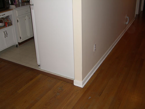 The floor around a wall was sagging over an inch. The wall is sitting part way across a 12 foot span of 16 on center 2 x 8 joists. Being a kitchen wall the the refrigerator and stove sit along one side and at one time sat next to a washer and drier! Past leaks from the washer had aggravated the problem as well.